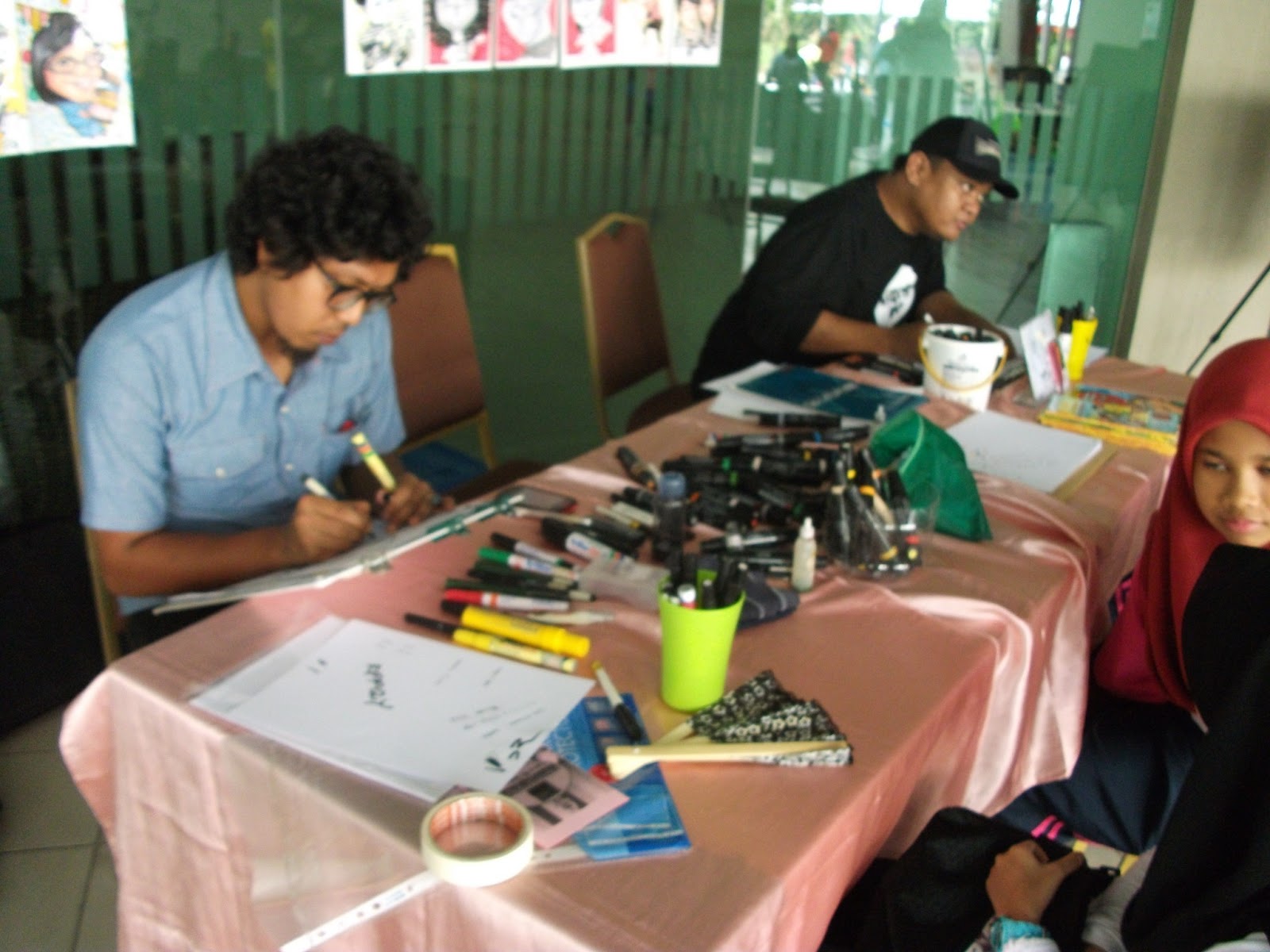 Meja "Karikatur Corner" yang berselerak dengan peralatan lukisan..